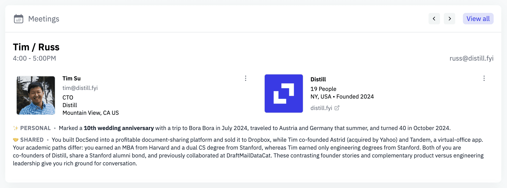 See detailed information about the people and companies from your upcoming meetings in Distill, including what you have in common with them and fun personal facts.